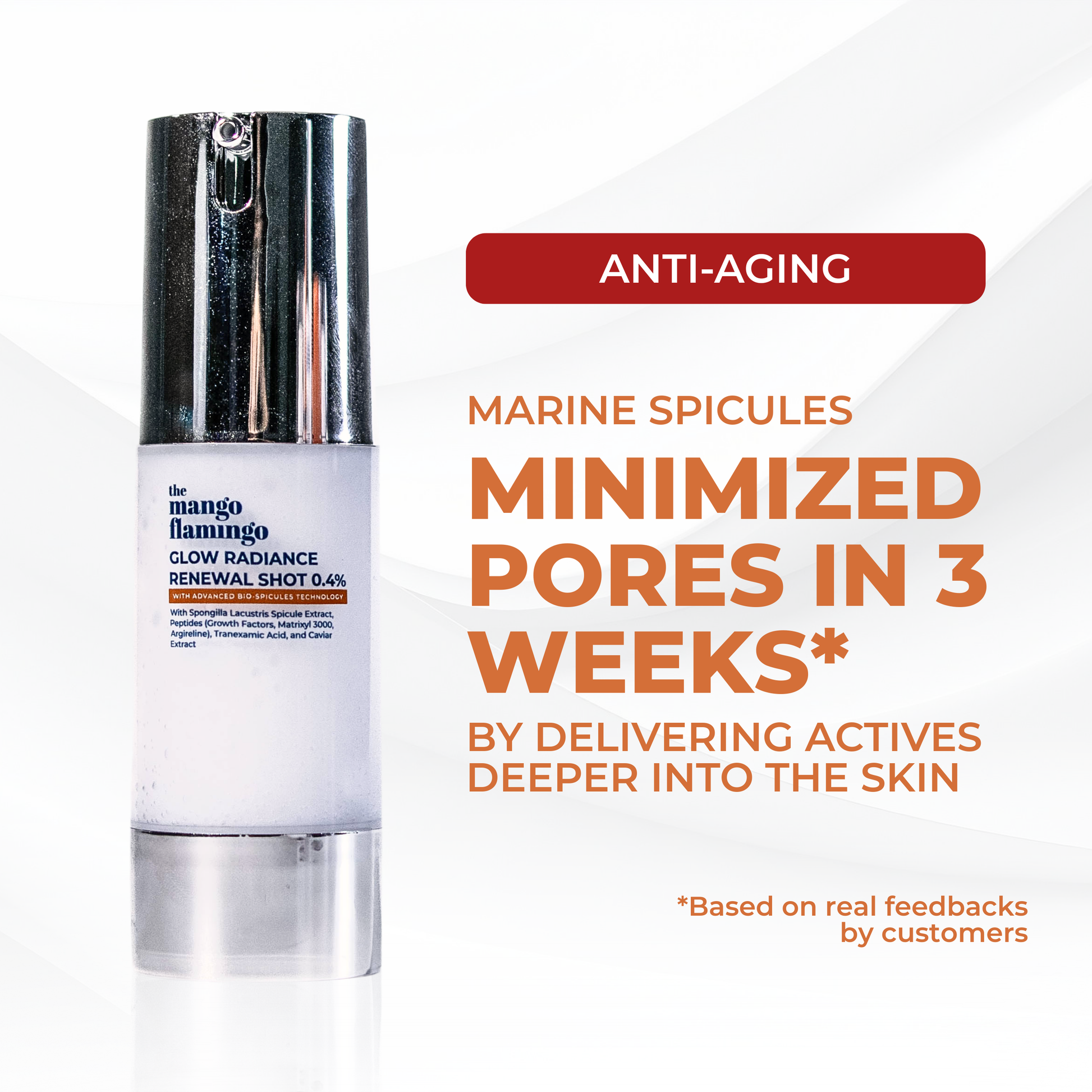 Elevate your skincare routine with The Mango Flamingo Glow Radiance Renewal Shot 0.4%, powered by Advanced Bio-Spicules Technology for deep skin renewal. Designed to boost radiance, refine texture, and diminish dark spots, this high-performance treatment combines scientifically backed ingredients with luxurious skin-loving extracts.
