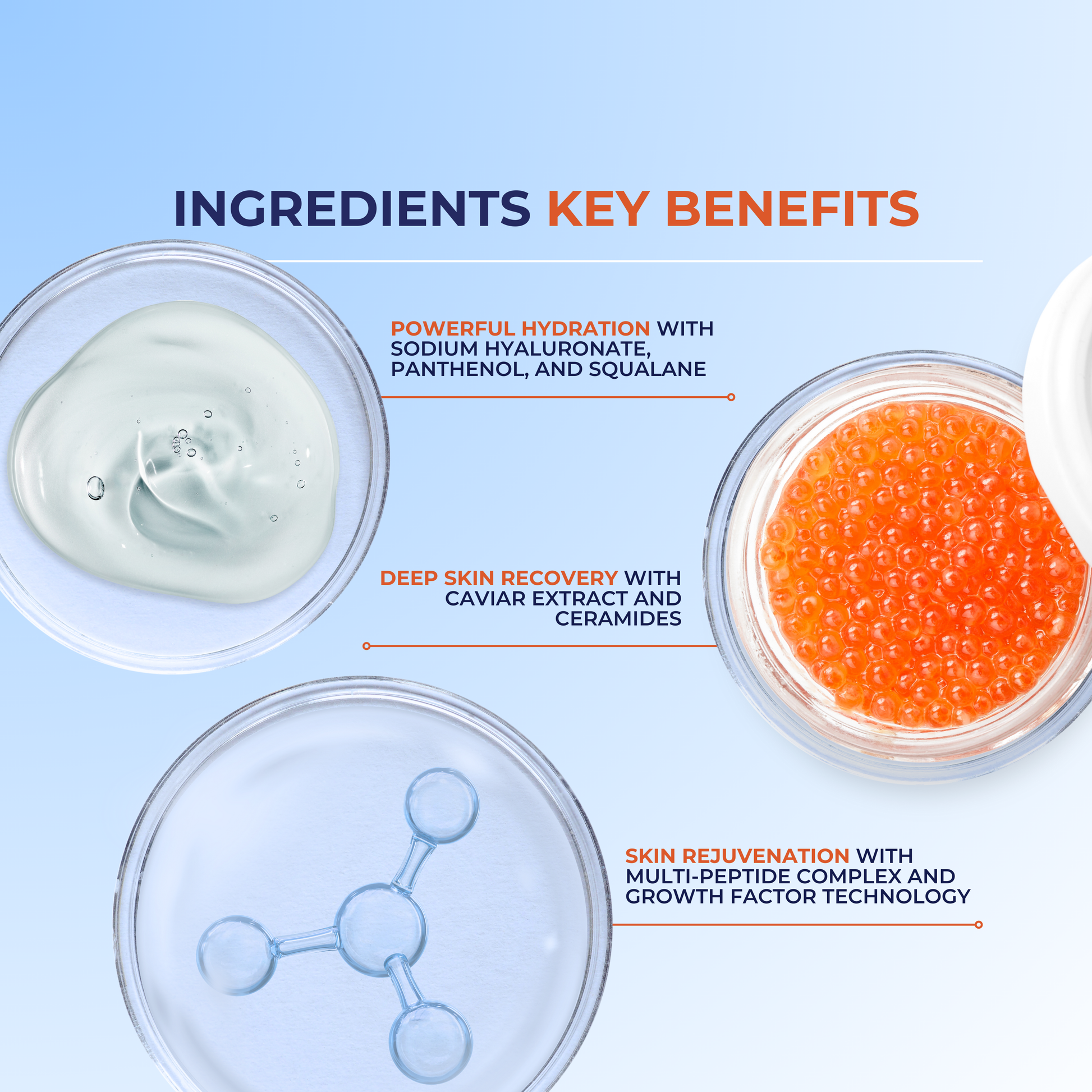 Aqua, Biosaccharide Gum-1, Centella Asiatica Extract, Squalane, Glyceryl Stearate, Glycerin, Butylene Glycol, Cetearyl Alcohol, PEG-100 Stearate, Tranexamic Acid, Spongilla Lacustris Spicule Extract, Bisabolol, Zea Mays (Corn) Kernel Extract, Panthenol, Sodium Hyaluronate, Hydrolyzed Collagen, Caviar Extract, Acetyl Hexapeptide-8, Ceramide NP, Lecithin, Acetyl Glutamine, sh-Oligopeptide-1, sh-Oligopeptide-2, sh-Polypeptide-1, sh-Polypeptide-9, sh-Polypeptide-11, Bacillus/Folic Acid Ferment Filtrate Extract, Carbomer, Polysorbate 20, Palmitoyl Tripeptide-1, Palmitoyl Tetrapeptide-7, Ascorbyl Glucoside, Caprylyl Glycol, Butylene Glycol, 1,2-Hexanediol, Tocopherol, Phenoxyethanol, Ethylhexylglycerin.