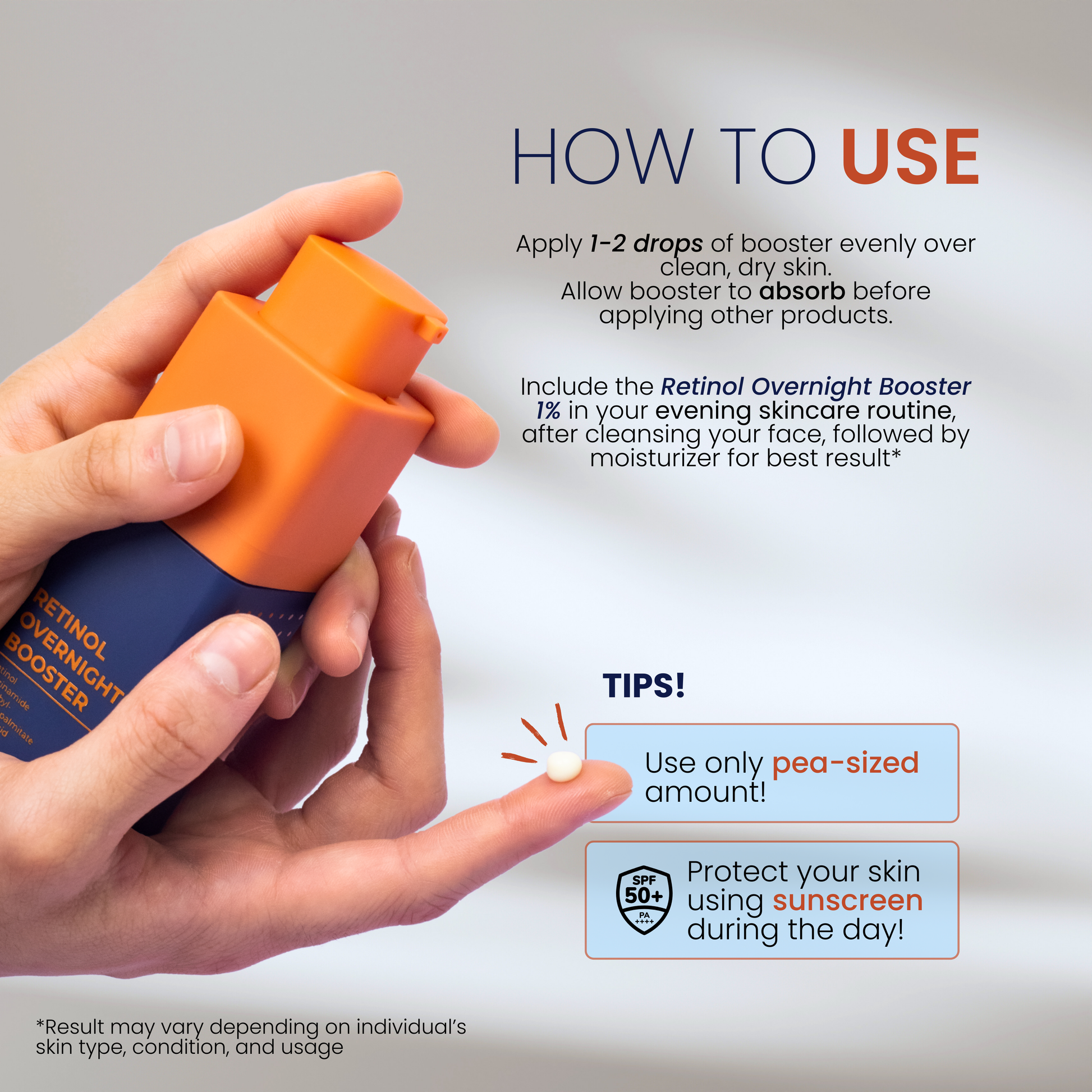 Dispense a pea-sized amount on your hand. Avoid applying too much product to minimize the risk of irritation. Dot the retinol onto your forehead, cheeks, chin, and nose. Gently spread it all over your face using the upward and outward motions. Avoid the eyes and lips area. Beginner: Recommended to use at least 1-2 times a week. Apply your retinol followed by your favorite moisturizer or use a sandwich method if you have dry skin.